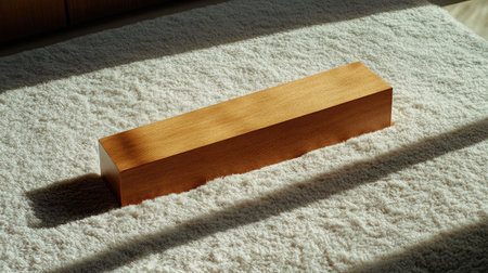Long box with warm finish resting atop plush white carpet, setting a serene tone in interior space