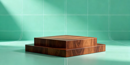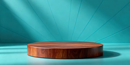 Classic old wooden podium with a polished surface, perfect for displaying luxury goods, set against a bright turquoise background. The vibrant color adds a modern twist to the timeless wood.