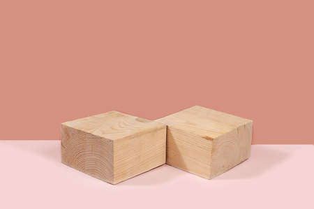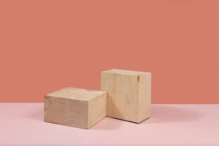 Abstract background with natural wood podiums, empty showcase for advertising or presentation of cosmetic products, scene with geometric shapes with place for text, minimal ecological concept