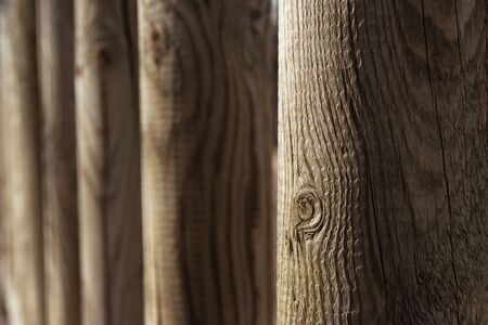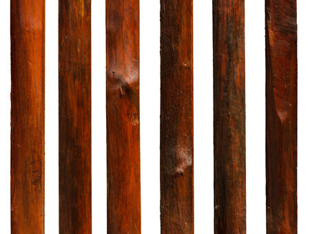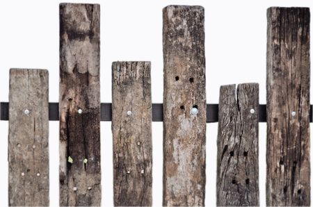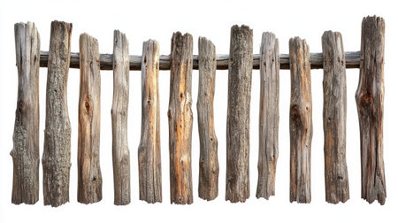 A collection of weathered wooden planks arranged on a horizontal beam. Ideal for backgrounds, this rustic image evokes natural beauty and simplicity.