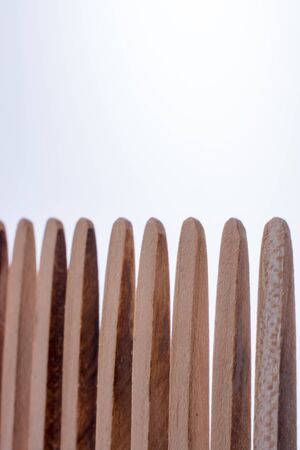 A bunch of wooden toothpicks are lined up on a black background. The toothpicks are all the same length and are arranged in a neat row