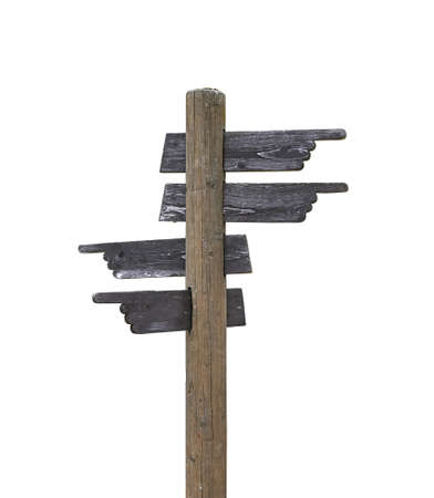 Old vintage road signpost with four hand shaped wooden planks blank copy space arrows different directions, left down and right, isolated on white background, low angle side view