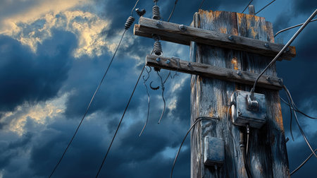 A weathered power pole stands against a dramatic stormy sky, capturing the raw beauty of rural infrastructure amid nature's ferocity.
