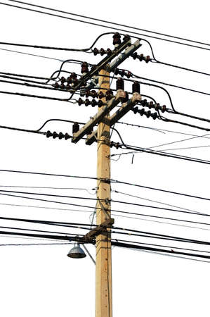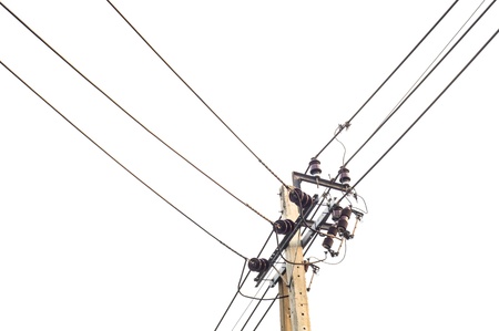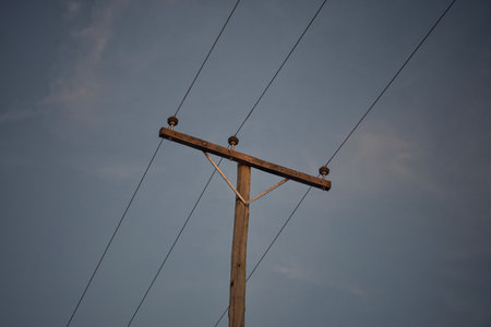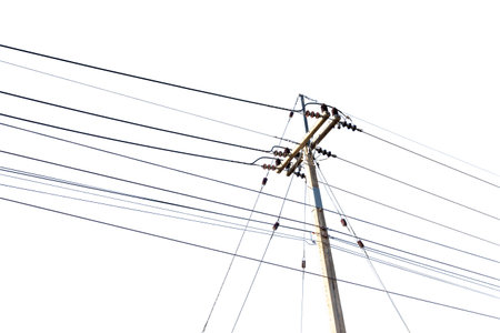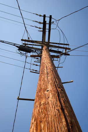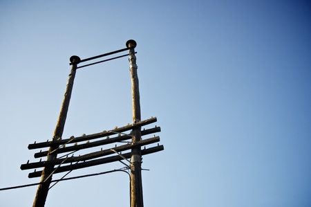 A low angle of a pole for energy transmission, wire and electricity post under a blue sky