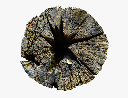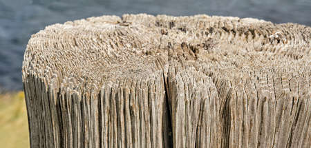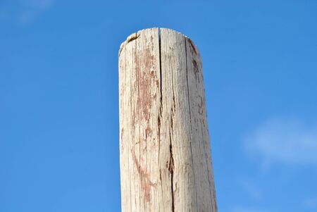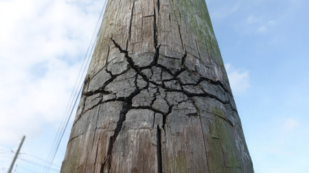 A close-up image of a cracked wooden pole under a clear blue sky showcases intricate details and textures that tell a story of time and weathering.