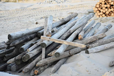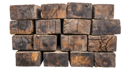 A stack of weathered wooden beams with visible cracks and rustic texture, showcasing natural grain and aged appearance. beams are arranged in neat, compact formation