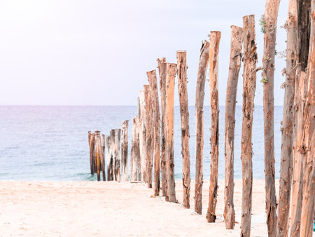 A group of wooden posts stands tall in front of a clear blue sky. The posts are weathered and aged, contrasting with the vibrant sky behind them.