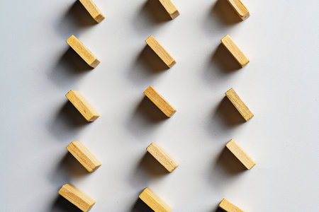 High-angle view of small wooden rectangles arranged in a diagonal grid pattern on a clean white surface. Perfect for background, design concepts, and abstract themes