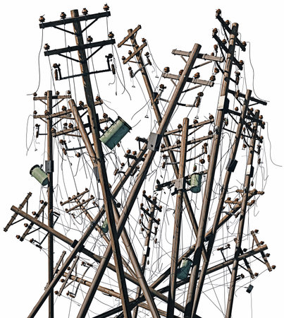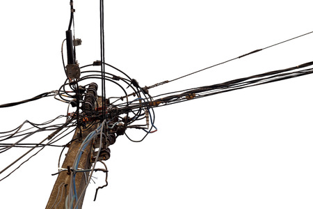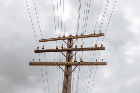 Two electricity poles, a wooden and a concrete one with electrical wires, selective focus