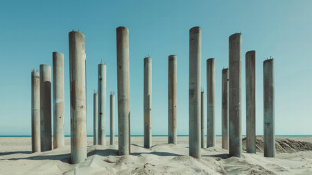 Rows of concrete pillars stand on a gray pavement casting long shadows in the soft morning light enhancing the urban landscape.