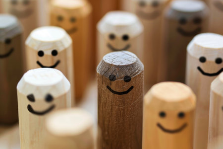 Smiling wooden pencils with smiley faces, close-up. The concept of inclusiveness.