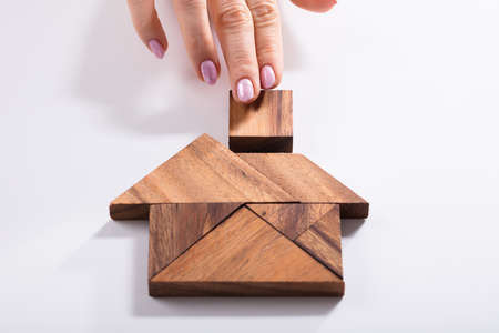 Elevated View Of A Woman's Hand Building House With Wooden Tangram Puzzle Over White Background