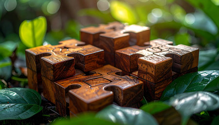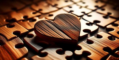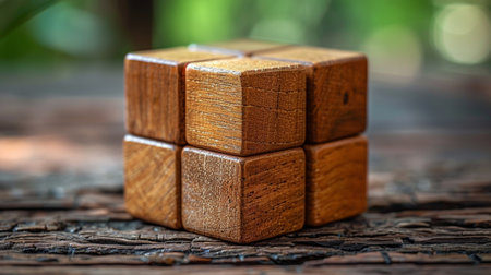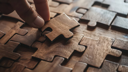 The wooden puzzle is arranged and completed. Concept of complex and smart logical thinking. Slightly defocused and close up shot. Copy space.