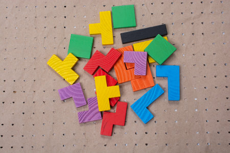 Concept of creative logical thinking. Different colorful wooden blocks. Geometric shapes in different colors.