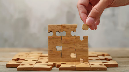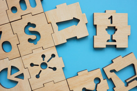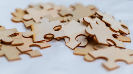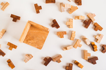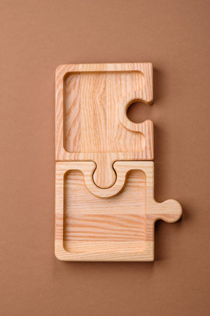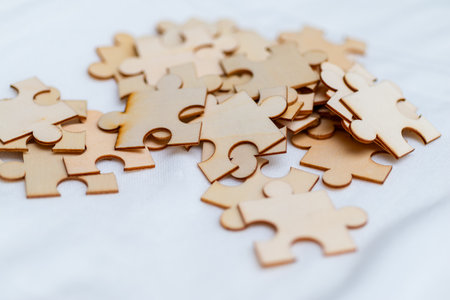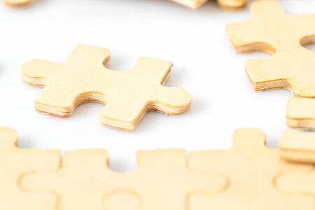 Top view Shot of wooden jigsaw puzzle pieces ,Business concept
