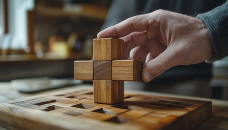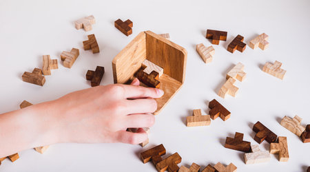 Organization and order. Children's hands fold the wooden puzzle pieces into a folding mold. Leisure for children