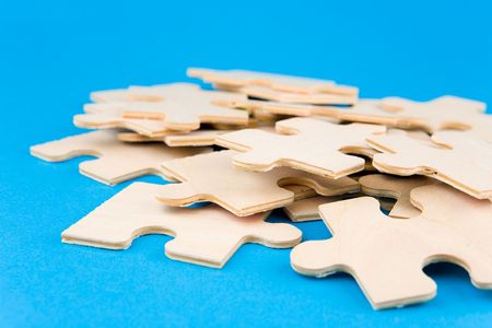 Wooden puzzle pieces on blue background