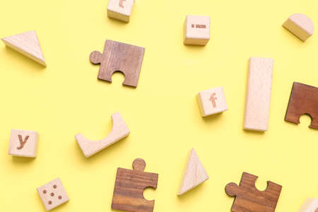 Wooden cubes with letters and puzzle pieces on yellow background