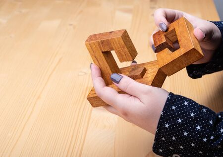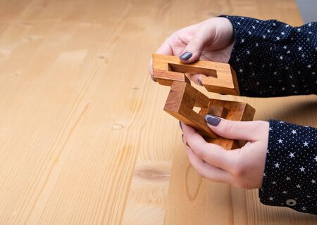 Girl solves the puzzle oblique knot. Dark manicure on nails. Puzzle concept. Copy space