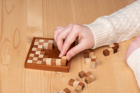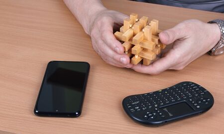 A person chooses a development intellectual wooden puzzle instead of electronic devices that lie on a table. Hands hold a constructed puzzle