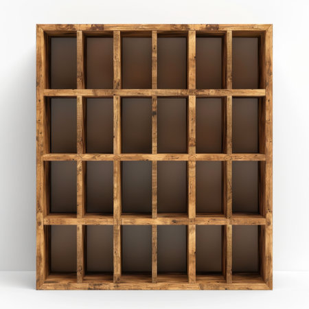 A vintage wooden display shelf featuring a grid design, ideal for organizing and showcasing items. This rustic piece complements any home decor style with its natural aesthetic.