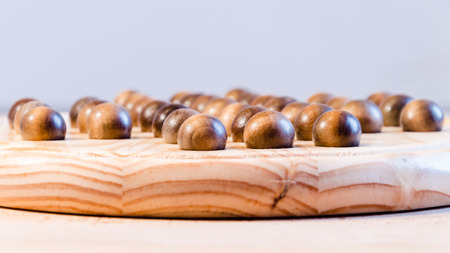 Close up view of a vintage accounting abacus showing the number twenty two made of wood with numbers engraved