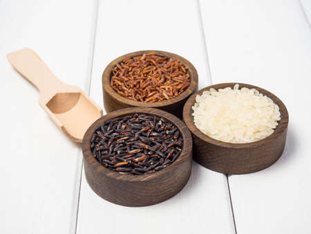 Three types of rice in wooden bowls on a white wooden table. red ,black and white rice ,copy space