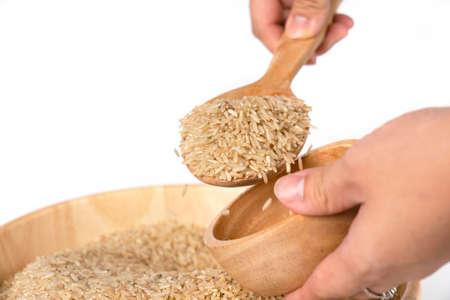 Brown raw brown rice on wooden spoon and woman's hand, scooping rice to prepare for cooking.