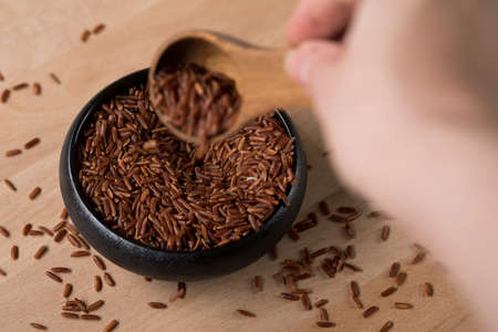 Woman take red skinned raw Jasmine rice in black bowl with spoon on wooden background and is a specialty from Cambodia AsiaWoman take red skinned raw Jasmine rice in black bowl with spoon on wooden background and is a specialty from Cambodia Asia