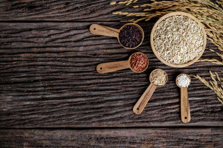 Top view five kinds of rice in bowl and spoon on wooden desk with spike rice. Copy space for text.