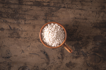 White raw rice in a bowl on a wooden table