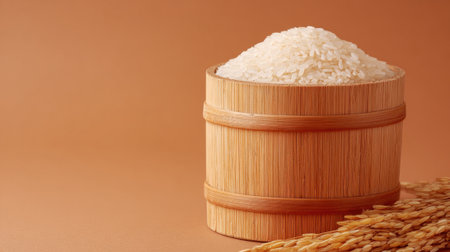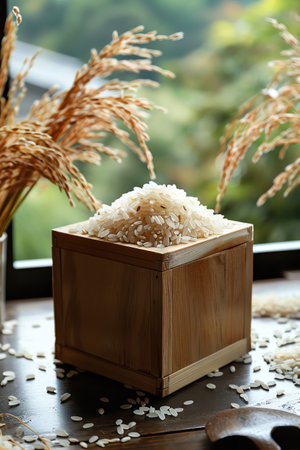 A wooden container holds fluffy white rice, next to dried rice stalks. The warm background enhances the natural colors, showing the beauty of grains.