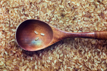 food background. brown rice in a wooden spoon close-up. top view. Cheap food for the starving and poor regions of Southeast Asia.
