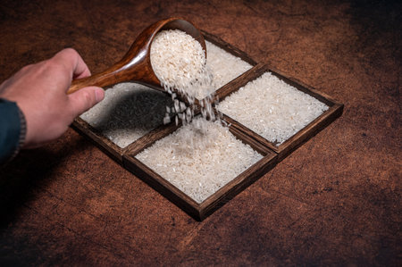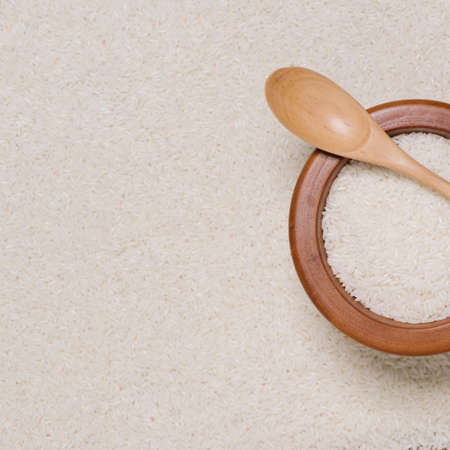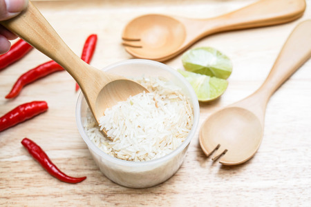 scoop up the rice with wooden spoon in food ingredients background