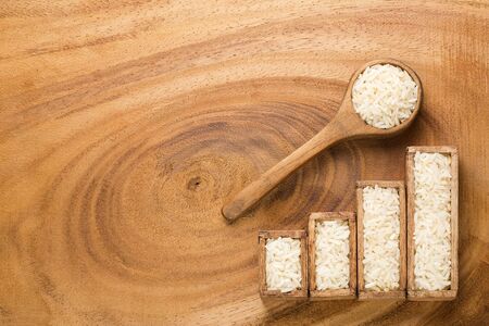 Long grain basmati medium grain jasmine short grain pilaf polau risotto brown low glycaemic index gi rice in wooden spoon on white background copy text space top flat lay view