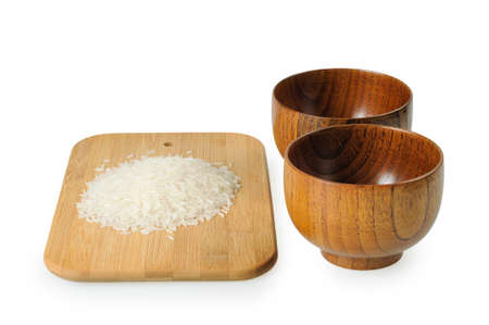 Wooden bowls for rice. A handful of rice on a wooden board.