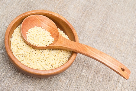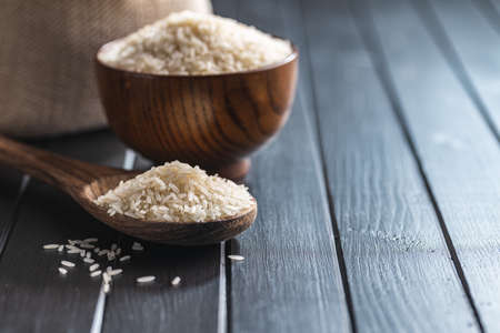 Raw white rice on a wooden spoon