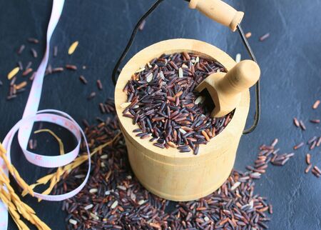 Organic Thai brown rice grain in wooden bowl on black background, Asian healthy food ingredients
