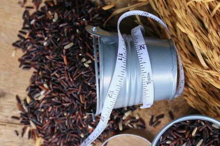 Pile of rice from a jar and measure tape. Healthy food and diet concept.