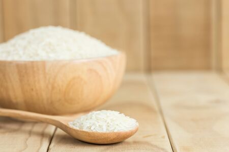 White rice (Thai Jasmine rice) in wooden bowl, selective focus