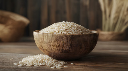 Close-up of a wooden bowl filled with uncooked rice on a rustic table, showcasing the texture and natural colors of the grain.