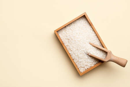 Box with raw rice and scoop on color background