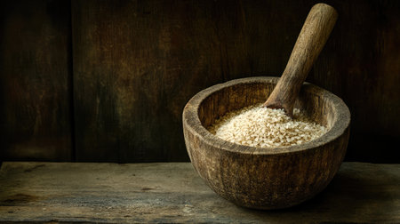 Explore the beauty of simplicity with this rustic image of a wooden bowl filled with raw white rice and a wooden pestle, ideal for food-related projects and culinary inspiration.