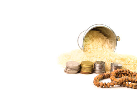 Front view of prayer beads, stack of coins and rice isolated on a white background. Zakat concept.