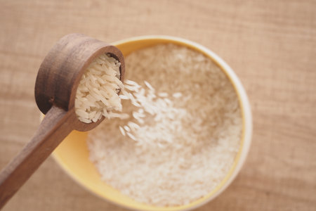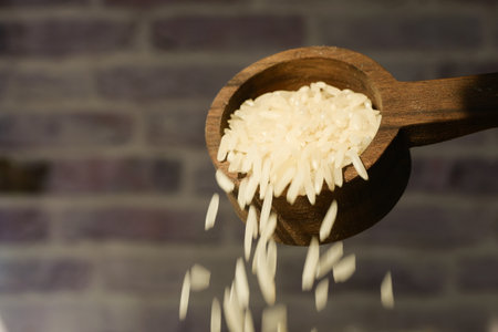 Raw white rice pouring from a wooden spoon