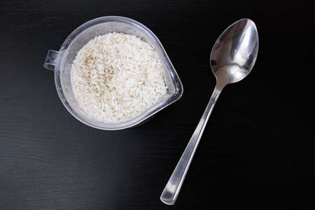 Uncooked white rice on a wooden spoon on a black table.