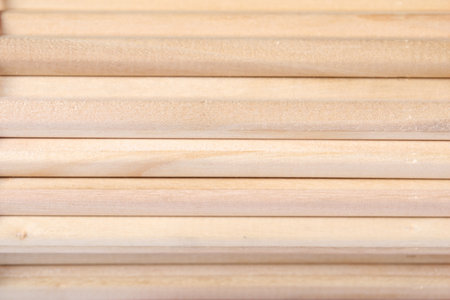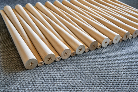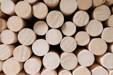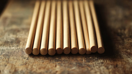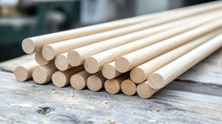 Smooth wooden dowels arranged on a workbench, showcasing fine grain and craftsmanship. Ideal for projects in carpentry and woodworking, highlighting industry materials.