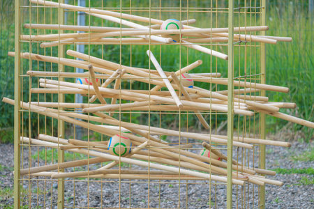Equipment for team building game - cage. Wooden sticks and balls in metal rods cage.