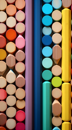 A variety of wooden cylinders in bright colors are neatly arranged in a visually appealing pattern. The rich textures and hues create an artistic and playful atmosphere.