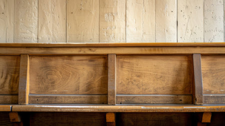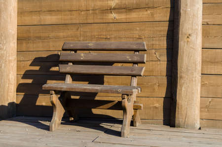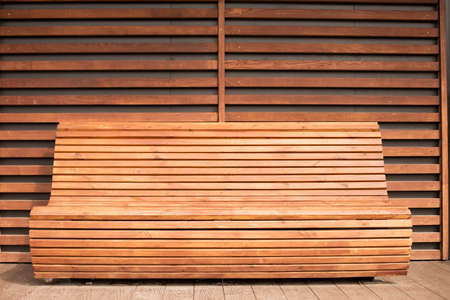 A wooden bench on the background of wooden wall.
